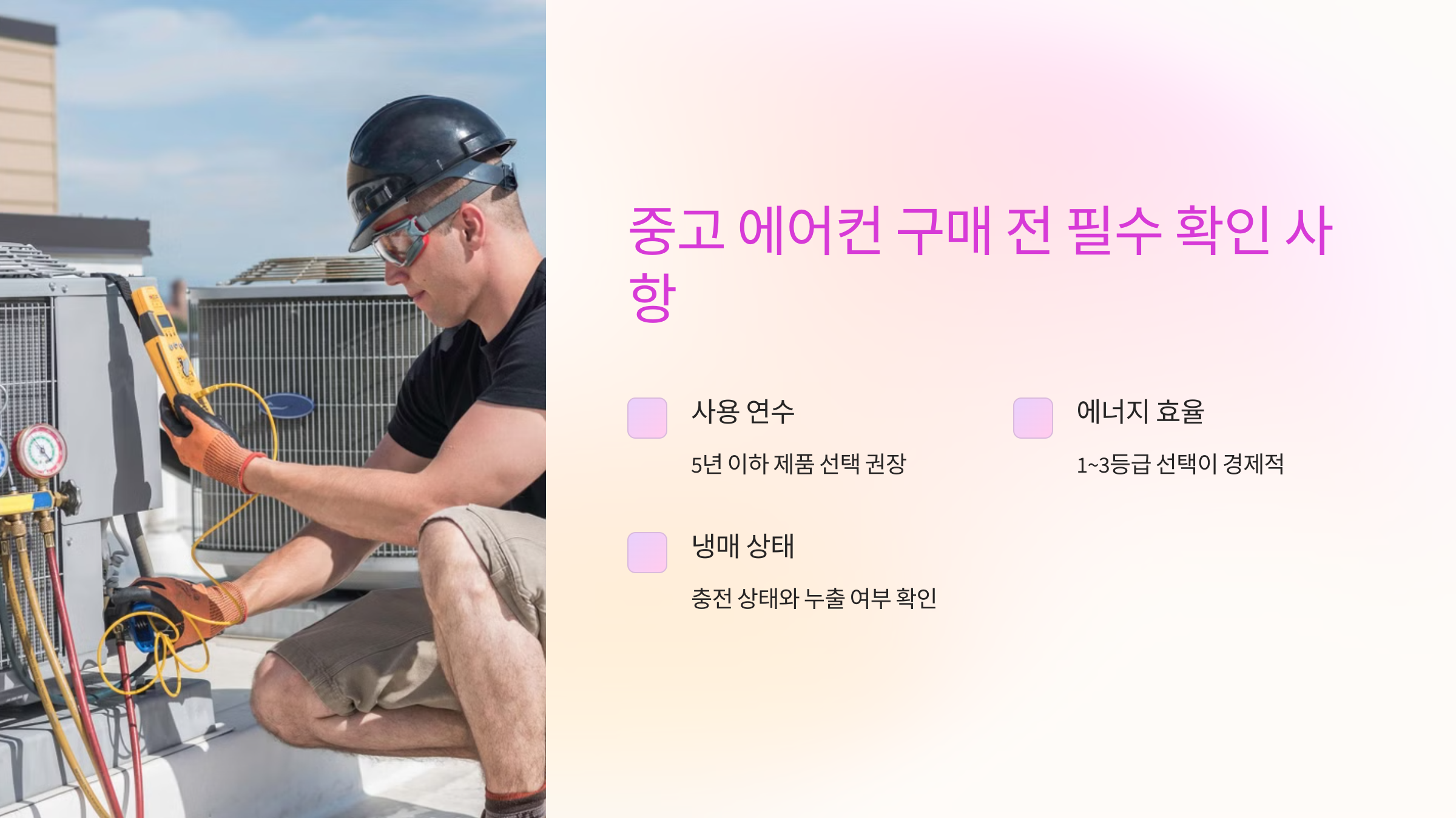- 사용 연수, 냉매 상태, 실외기 점검 등 중요한 요소를 꼼꼼히 확인하세요.